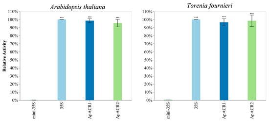 Relative transcriptional activities (LUC/REN) of ApACR1 and ApACR2 in A. thaliana and T. fournieri protoplasts, measured as relative luciferase activity. Mini35S served as negative control, and 35S promoter as a positive control. Error bars represent standard error of five biological replicates. LUC represents firefly luciferase activity; REN represents renilla luciferase activity. Asterisks (***) indicated significant difference compared to entry control (mini-35S) by Student’s t-test (p < 0.01). Error bars indicate standard deviation of five biological replicates.