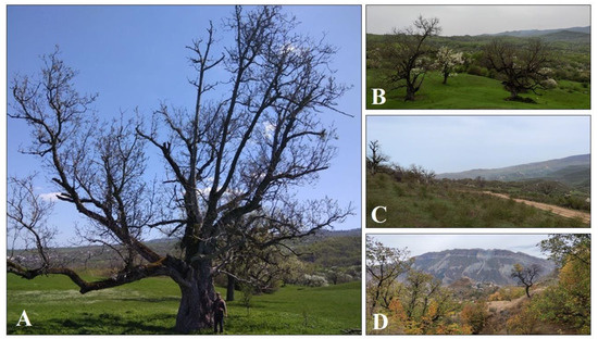 Photos of some Persian walnuts grown in the Dagestan territory. (A) An aged walnut tree in the vicinity of the village of Dyubek (approximate age is about 150–200 years; Anatov Dzhalaludin is staying on right side from the tree). (B) Two aged walnut trees on the pasture meadow nearby the Dyubek. (C) Walnut trees on the slope along the mountain road to the village of Kakhtsug (left side from the road). (D) Walnut trees on the slopes of the canyon closely to Khotoch.
