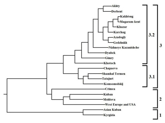 Cluster 1 is represented by varieties from Kyrgyzstan and Kuban varieties of Asian origin. This cluster is the most genetically distant from the other studied groups. Cluster 2 is formed by groups of varieties from Moldova, Kuban, Crimea, Western Europe, and USA. Cluster 3 included population selections from Dagestan. Cluster 3 included two subclusters: subcluster 3.1 (sampling points from Flatland Dagestan) and subcluster 3.2 (sampling points from Mountain Dagestan).