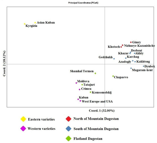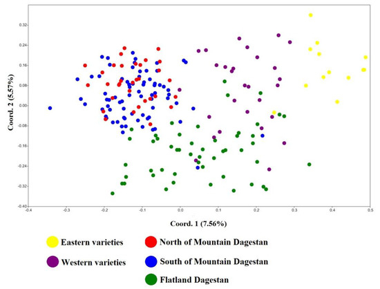 The distribution of individual samples on the PCoA graph reflects their geography as well (Figure 5). Thus, samples from Mountain Dagestan are located in the upper left part; samples from Flatland Dagestan occupied the lower part; varieties of Western origin are in the right part; varieties of Central Asian origin are located in the upper right corner. However, this approach did not allow us to separate samples from the North and South of Mountain Dagestan.
