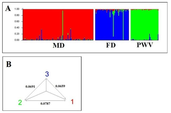 Graph of analysis of walnut varieties and population samples in the STRUCTURE program. (A) STRUCTURE graph: MD—Mountain Dagestan, FD—Flatland Dagestan, PWV—Persian walnut varieties. (B) The NJ tree displays the genetic distances between the three clusters used in the STRUCTURE graph. The values of the genetic distances between the clusters are presented in the graph. Cluster 1—red color, cluster 2—green color, cluster 3—blue color.
