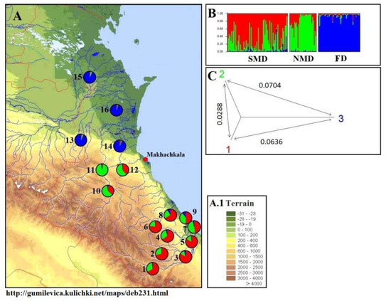 Comparison of the analysis results of population selections in the STRUCTURE software with geographical location of the samples. (A) Location of population sampling points of walnut on the map of Dagestan. The sampling points are presented as diagrams showing the contribution shares of the three clusters in local samples. Name of sampling points: 1—Akhty, 2—Kakhtsug, 3—Magaramkent, 4—Karchag, 5—Azadogly, 6—Dyubek, 7—Khazar, 8—Gedzhukh, 9—Derbent, 10—Khotoch, 11—Gimry, 12—Nizhneye Kazanishche, 13—Chapaevo, 14—Shamhal Termen, 15—Komsomolskij, 16—Tatajurt. (A.1) Terrain (altitude above sea level is given in meters). (B) Distribution graph of samples between three clusters calculated in the STRUCTURE program. Groups highlighted on the graph: SMD—South of Mountain Dagestan, NMD—North of Mountain Dagestan, FD—Flatland Dagestan. (C) The NJ tree displays the genetic distances between the three clusters used in the STRUCTURE graph. The values of the genetic distances between the clusters are presented in the graph. Cluster 1—red color, cluster 2—green color, cluster 3—blue color.