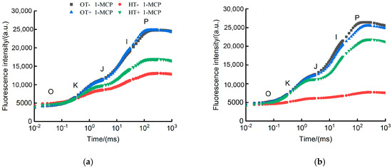 The results indicated that the OJIP transient curves showed a significant decline for both the two accession groups after 9 h heat stress compared to the control (Figure 1). However, the OJIP levels in the heat-tolerant accessions remained higher than those in the heat-sensitive ones. Fm values decreased significantly after heat stress; Fo values remained unchanged in the two groups. However, the results showed that the I and J phases were higher in the two 1-MCP-treated groups of accessions than those of the untreated control. Compared with the untreated control, the Fm was significantly increased by 29.26% and 182.59% in the two accessions with the application of 1-MCP, respectively (Figure 1a,b).