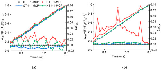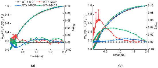 To further analyze the differences among various samples under different treatments, as reflected in the OK (Figure 2) and OJ (Figure 3) phases, additional normalizations (left vertical axis) and corresponding subtractions (difference kinetics; right vertical axis) were applied. As shown in Figure 2a,b, the results demonstrated that exposure to heat stress led to a notable reduction in energetic connectivity, as indicated by positive L-bands (Figure 2a), with the strongest effects in heat-sensitive accessions (Figure 2b). By contrast, plants treated with 1-MCP displayed higher connectivity compared to the untreated control for the two groups of accessions. Enhanced connectivity contributed to more efficient utilization of excitation energy and greater system stability [38].