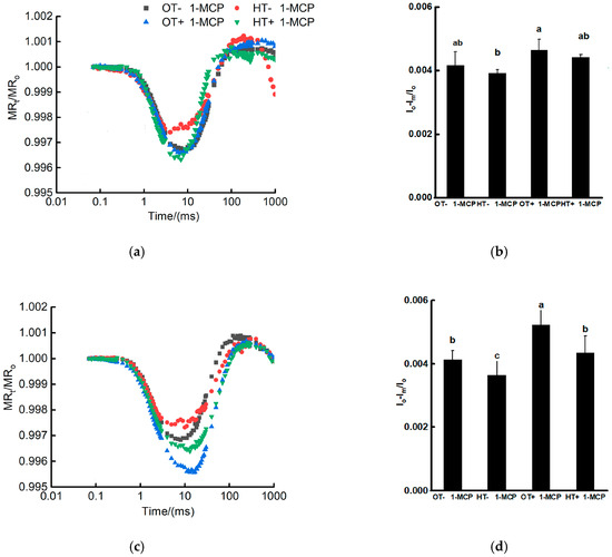 The effects of heat stress and 1-MCP on the MR820 nm of the heat-tolerant (a) and heat-sensitive (b) chrysanthemum accessions. The MR820 nm signals are presented by MRt/MRo ratio. ΔI/Io is the relative signal dropped at 820 nm during red light irradiation and indicates PSI activity, which is presented in (c,d). Different letters on error bars indicate significant difference at p < 0.05.