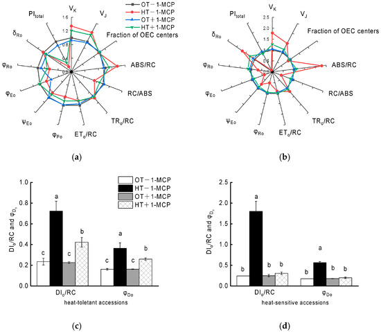 As shown in Figure 3a,b, the results demonstrated that a clear positive K-band (at about 300 μs) was elicited in heat-sensitive accessions but not distinctly in heat-tolerant accessions under heat stress. However, exogenous 1-MCP in the heat stress alleviated this increase. Taken together, the application of 1-MCP altered the shape of the OJIP curves and enhanced photosynthetic performance.