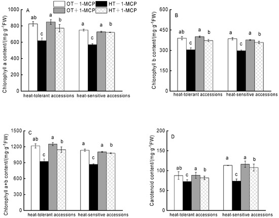 The effects of heat stress and 1-MCP on the Chl a content (A), Chl b content (B), Chl a + b content (C), and carotenoid content (D) of the heat-tolerant and heat-sensitive chrysanthemum accessions. Different letters on error bars indicate significant difference at p < 0.05.