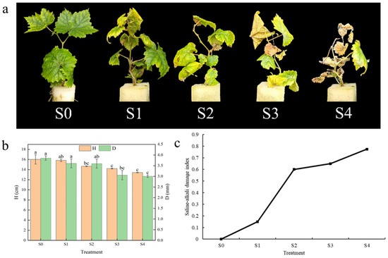Before the saline–alkali stress treatment, 3 seedlings with the same growth were randomly selected from each group, and the plant height (H, cm) and shoot diameter (D, mm) were measured using vernier callipers and straighteners (Shenzhen Shenzhu Precision Measuring Instrument Co., Ltd., Shenzhen, China). The saline–alkali damage index was determined according to the method of Du [21], and the saline–alkali damage criteria were divided into 5 levels: Level 0, no signs of saline–alkali damage; Level 1, mild saline–alkali damage, with a small part of the leaf tips, leaf margins or veins turning yellow; Level 2, moderate saline–alkali damage, with more than half of the leaf tips, leaf margins or veins scorched; Level 3, severe saline–alkali damage, with most of the leaf blades scorched or defoliated and Level 4, very severe saline–alkali damage, with wilting, defoliation and plant death.