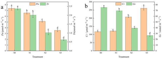 Effects of different saline–alkali stresses on photosynthetic parameters of Hotan Red. (a) The net photosynthetic rate (Pn) and transpiration rate (Tr) of ‘Hotan Red’ leaves after different saline-alkali stress treatments; (b) The intercellular carbon dioxide concentration (Ci) and stomatal conductance (Gs) of ‘Hotan Red’ leaves after treatment Different lowercase letters in the graphs indicate significant differences between treatments at the p < 0.05 level.