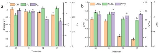 As can be seen in Figure 3a, the chlorophyll (ChI) content tended to decrease with increasing saline–alkali stress leading to the treatments, and ChI was significantly lower than that of the control under S1, S2 and S3 treatments, with ChI after S3 treatment being 0.85 times higher than that of the control (0.87 mg·g−1). In addition, there was no significant difference in ChI between S1 and S2 treatments. It indicated that Hotan Red ChI increased the decomposition rate with increased saline–alkali stress. To further elucidate the extent of chloroplast damage under saline–alkali stress, chlorophyll fluorescence parameters were determined in this study. The results showed (Figure 3a) that the initial fluorescence (Fo) showed an increasing trend in contrast to ChI, and Fo was significantly higher than the control in all treatments at 126.05, 138.58 and 140.61, respectively. Maximum fluorescence (Fm) showed a decreasing trend with increasing saline–alkali stress, with Fm under S2 and S3 treatments being significantly lower than that of the control, whereas there was no significant difference in Fm between S1 and the control and between S2 and S3 treatments, with Fm under the S1 treatment being reduced by only 2.64% compared to the control. The actual photochemical efficiency of PSII in the light (φPSII) indicates the actual photochemical efficiency of PSII in the light after partial closure of the PSII reaction centre under illuminated conditions and reflects the efficiency of light energy use. As seen in Figure 3b, φPSII showed a decreasing trend with increasing saline–alkali stress, and φPSII was significantly lower than that of the control under both S2 and S3 treatments, with decreases of 63.04% and 74.20%, respectively, while the difference between φPSII and control under S1 treatment was not significant and only decreased by 6.63%. The maximal quantum yield of PSII (Fv/Fm) reflects the maximum conversion efficiency of primary light energy in the PSII reaction centre and is an effective indicator of the degree of photoinhibition. The trend of Fv/Fm as affected by saline–alkali stress was similar to that of φPSII, with Fv/Fm in both S2 and S3 treatments being significantly lower than in the control at 0.62 and 0.60, respectively. The non-photochemical quenching coefficient (NPQ) reflects the photoprotective capacity of the leaves. With increasing saline–alkali stress, the NPQ showed an ‘N’-type trend, reaching a maximum value of 1.16 after S1 treatment.