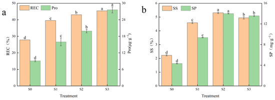 As can be seen in Figure 4a, the relative conductivity (REC) and proline (Pro) content tended to increase with increasing saline–alkali stress. The REC varied significantly among the treatments with increases of 42.31, 54.78 and 63.12 percent, respectively, compared to the control. Pro content, under S1, S2 and S3 treatments, was significantly higher than the control, reaching a maximum value of 27.60 μg·g−1 with an increase of 203.41% under S3 treatment, while Pro under S1 and S2 treatments increased by 75.78% and 118.85% as compared to the control. Figure 4b shows the soluble sugar (SS) content and soluble protein (SP) content of Hotan Red leaves after treatment. The SS content showed an increasing and then decreasing trend with increasing saline–alkali stress, reaching a peak of 5.31% under the S2 treatment, which was nearly 138.46% higher than the control. In addition, SS content in the leaves of Hotan Red was significantly higher than that of the control after each saline–alkali stress treatment, and the changes were large, and only the S1 treatment increased the SS content by 105.88% compared with that of the control. The trend of SP content with increasing saline–alkali stress was similar to that of SS content, first increasing and then decreasing, and also reaching a peak value of 14.01 mg·g−1 under S2 treatment. The SP content under all treatments was significantly higher than under the control, with increases of 115.12%, 222.10% and 211.99%, respectively, compared to the control. In summary, with the increase in saline–alkali stress, osmoregulatory substances in the leaves of Hotan Red accumulate in large quantities in response to the damage caused by osmotic stress to the plant.