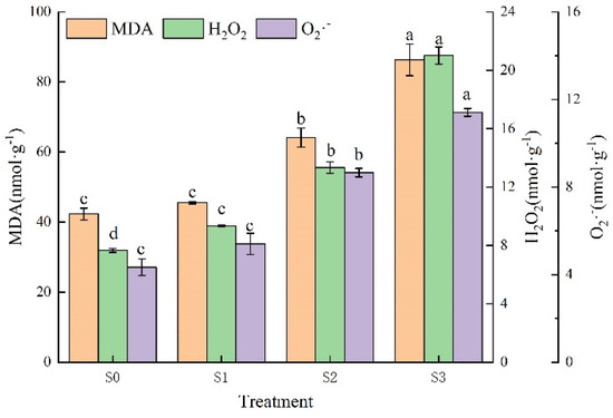 Malondialdehyde (MDA) and reactive oxygen species (ROS) are both products of the peroxidation of cellular structures when plants are exposed to stress and are key signalling molecules that enable cells to respond rapidly to various stimuli, with ROS including superoxide anions (O2·−) and hydrogen peroxide (H2O2). As can be seen in Figure 5, saline–alkali stress led to an increase in MDA content by, 7.63%, 51.61% and 104.05%, respectively, which was significantly higher than the control under S2 and S3 treatments. The H2O2 content was significantly higher under all saline–alkali stress treatments with increases of 22.31%, 74.40% and 174.72%, respectively. With the elevation of saline–alkali stress O2·− content showed an increasing trend, reaching a maximum value of 11.42 nmol·g−1 under S3 treatment, with an increase of 162.82%. Although the difference between O2·− under S1 treatment and the control was not significant, the increase was nearly 24.50% over the control.