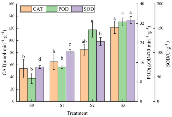 Catalase (CAT) is an anti-ageing protective enzyme of organisms that maintains the stability and integrity of cell membranes and catalyses the decomposition of H2O2 into O2 and H2O. As shown in Figure 6, with increased saline–alkali stress, CAT activity showed an increasing trend, reaching a maximum value of 121.58 μmol·min−1·g−1 under S3 treatment, which was significantly higher than that of control; CAT activity under S1 and S2 treatments was not significantly different from that of the control, but increased by 20.96% and 57.69%, respectively, compared with the control. Peroxidase (POD) catalyses the reaction between H2O2 and other substrates and has the effect of eliminating H2O2. POD activity in the leaves of Hotan Red showed an increasing trend under saline–alkali stress and was significantly higher than the control under S2 and S3 treatments, with increases of 209.48% and 243.16%, respectively, whereas there was no significant difference between S1 and the control, and between S2 and S3. Superoxide dismutases (SOD) are a class of enzymes that catalyse the disproportionation of O2·− to H2O2 and O2. With the elevation of saline–alkali stress, SOD activity showed an increasing trend and was significantly higher than the control under all treatments. The S3 treatment reached the highest value of 166.73 U·g−1, which increased by 136.43% from the control and was 3.08 and 1.83 times higher than the increase in SOD activity under the S1 and S2 treatments, respectively.