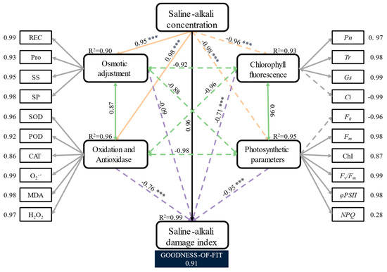 Partial least squares path model analysis of the drivers of the saline–alkali damage index of Hotan Red. The partial least squares path model (PLS-PM) shows the relationship between four latent variables, osmoregulatory substances, oxidative and antioxidant enzymes, chlorophyll fluorescence parameters and photosynthetic parameters and the saline–alkali damage index. In the figure, the orange line shows the effect of the saline–alkali treatments on the latent variables, the purple line shows the relationship between the latent variables and the saline–alkali damage index, the green pigmented line shows the interrelationships between the latent variables in the model, the grey line shows the loading coefficients between the latent variables and the observed variables in the model and the solid and dashed lines show the positive and negative path coefficients, respectively. R2 is the coefficient of determination of the paths, with a significance level of *** (p < 0.001), and the goodness of fit of the model is 0.91.