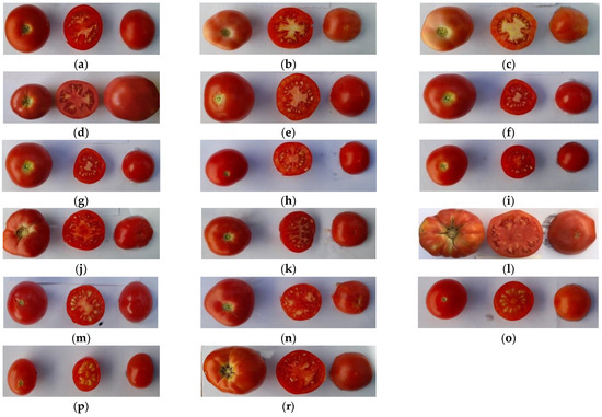 (a) Moneymaker; (b) de Ramellet; (c) de Ramellet tres cantos; (d) Valldemossa; (e) Seccagno PSC1-1; (f) CC-1791 Allungato a Fiasco; (g) CC-1665 Pollena; (h) Corbarino; (i) GRC-451/04; (j) ATS-048/06; (k) Ntomataki; (l) Chondrokats; (m) Cherry-INRAE 1; (n) Cherry-INRAE 2; (o) Cherry-INRAE 3; (p) Cherry-INRAE 4; (r) TR 62367.