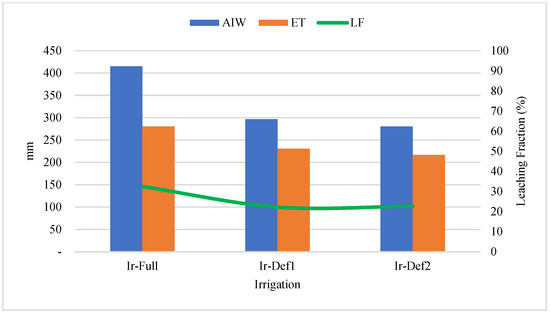 Total applied irrigation water (AIW), evapotranspiration (ET), and leaching fraction (LF) in three irrigation treatments: Ir-Full: Full irrigation; Ir-Def1: Deficit 1 by reducing the irrigation volume by 35%; Ir-Def2: Deficit 2 by reducing the irrigation volume by 50%.