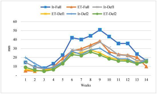 During the experiment, the amount of water applied to the Ir-Full during the growing season was 414.83 mm, 296.72 mm to the Ir-Def1, and 280.31 mm to the Ir-Def2. Plant water consumption varied according to the irrigation water and drained solution applied. Figure 2 shows the total amount of irrigation water applied to Ir-Full, Ir-Def1, and Ir-Def2, as well as plant water consumption and leaching fractions.