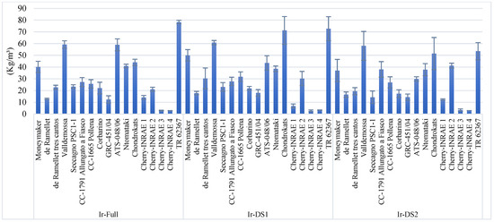 The effects of landraces on irrigation water use efficiency (WUE) differed significantly. The WUE ranged between 29.74 (Valldemossa × Ir-Def2) and 0.96 (Cherry-INRAE 3 × Ir-Full) kg m−3 (Figure 4). The reduction of irrigation water applied by 50% increased WUEs in 11 landraces.