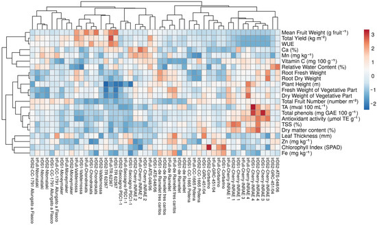 A heatmap was created using the package ClustVis (https://biit.cs.ut.ee/clustvis/ accessed on 25 February 2024), the correlation distance similarity measure, and the average linkage method for hierarchical clustering, using parameters that reveal differences between treatments [37]. The data were graded using an artificial color scale, where red indicated the highest parameter values that gradually decreased towards blue.