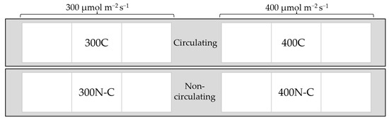 Representative illustration of light intensity and irrigation treatments: two light intensities in the same row and two irrigation methods across rows. The 300C, 300N-C, 400C, and 400N-C 400 represent the light intensity at 300 µmol m−2 s−1 with circulating irrigation, 300 µmol m−2 s−1 with non-circulating irrigation, 400 µmol m−2 s−1 with circulating irrigation, and 400 µmol m−2 s−1 with non-circulating irrigation, respectively.