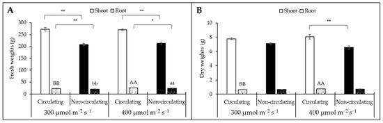 Fresh weights (A) and dry weights (B) of red oak lettuce when treated under 300 and 400 µmol m−2 s−1 with circulating and non-circulating irrigation for 7 days before harvesting. The vertical bars are presented as mean value ± SE; n = 20, according to the independent samples t-test. The asterisks indicate a significant difference between the circulation methods in each lighting of 300 and 400 µmol m−2 s−1 by * (p ≤ 0.05) and ** (p ≤ 0.01). Uppercase and lowercase letters indicate a significant difference between the lighting under circulating and non-circulating irrigations, respectively. When p ≤ 0.01 is represented by double letters. Moreover, 300C served as the control in this experiment.