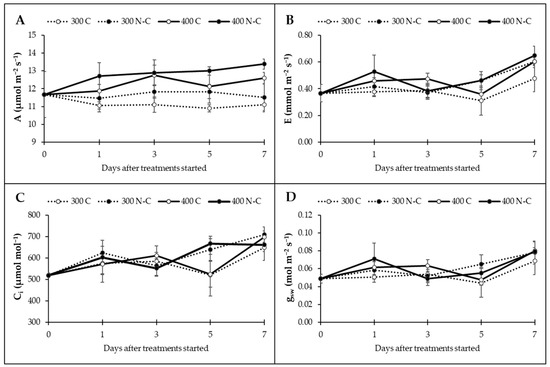 As shown in Figure 4, key gas exchange parameters, including net CO2 assimilation rate (A), transpiration rate (E), internal CO2 concentration (Ci), and stomatal conductance (gsw), fluctuated over the seven days after the treatments. Statistical analysis revealed that E, Ci, and gsw were unaffected by light intensity or irrigation methods from the beginning until the harvesting day in this experiment. However, on the 7th day, A showed a significant difference between the 300C and 400C treatments (11.1 and 12.6 µmol m−2 s−1), while the treatments with N-C showed a slightly greater trend than those with C. The trend in A across treatments demonstrated that 400N-C had the highest value (13.38 µmol m−2 s−1), followed by 400C, 300N-C, and 300C, respectively.