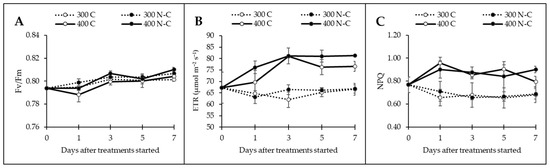 Chlorophyll fluorescence parameters of red oak lettuce when treated under 300 and 400 µmol m−2 s−1 of light intensities with circulating and non-circulating irrigation for 7 days before harvesting. Those were (A) the variable/maximal fluorescence ratio, Fv/Fm; (B) the electron transport rate, ETR; and (C) the non-photochemical quenching, NPQ. The points are presented as mean value ± SE; n = 12. The numbers 300 and 400 before the letters represent light intensities in the PPFD unit. C and N-C after numbers mean circulating and non-circulating irrigations.