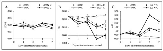Spectral indices of red oak lettuce when treated under 300 and 400 µmol m−2 s−1 of light intensities with circulating and non-circulating irrigation for 7 days before harvesting. Those were (A) the normalized difference vegetation index, NDVI; (B) the photochemical reflectance index, PRI; and (C) the anthocyanin reflectance index, ARI1. The points are presented as mean value ± SE; n = 20. The numbers 300 and 400 before the letters represent light intensities in the PPFD unit. C and N-C after numbers mean circulating and non-circulating irrigations. The 300C was served as the control.