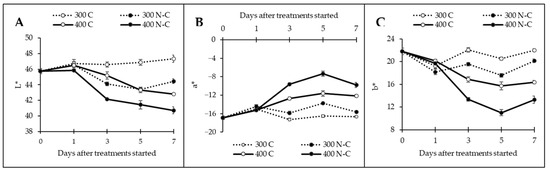 When comparing treatments, the average L* value for the 400N-C treatment exhibited a trend toward a darker color (Figure 8A), while the 300C treatment maintained a consistent average value over the 7-day period. Additionally, the a* and b* values began to diverge significantly from day 3 and deepest on day 5. By day 5, the color differences in red oak lettuce became visually apparent. The lowest significant lightness value was recorded for the 400N-C treatment at 40.7, indicating a 13.95% decrease compared to the 300C treatment (47.3) on day 7. Furthermore, the 400N-C treatment exhibited a significantly redder (+a*) and bluer (−b*) hue (−9.8 and 13.3, respectively) compared to the 400C, 300N-C, and 300C treatments.