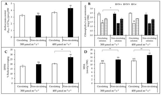 (A) Anthocyanin content, (B) photosynthetic pigments, (C) % radical scavenging, and (D) malondialdehyde of red oak lettuce when treated under 300 and 400 µmol m−2 s−1 with circulating and non-circulating irrigation for 7 days before harvesting. The vertical bars are presented as mean value ± SE (n = 12) according to independent samples t-test. The asterisks indicate a significant difference between the circulation methods in each lighting of 300 and 400 µmol m−2 s−1 by * (p ≤ 0.05) and ** (p ≤ 0.01). Uppercase and lowercase letters indicate a significant difference between the lighting under circulating and non-circulating irrigations. When p ≤ 0.05 and p ≤ 0.01 are represented by single and double letters, respectively. The 300C was served as the control.