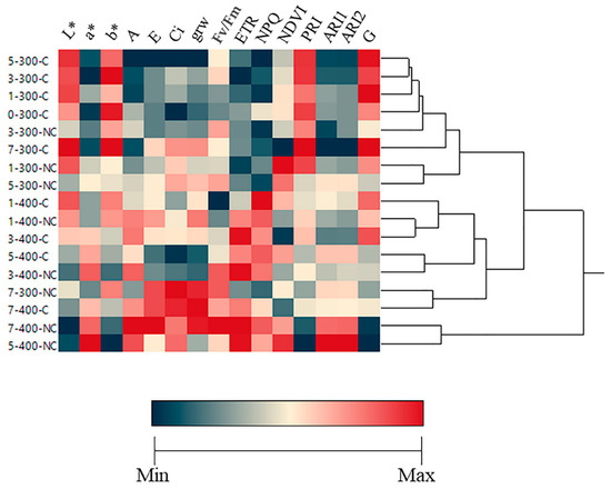 Heat map produced by cluster analysis, lightness (L*), red/green (a*), blue/yellow (b*), photosynthesis rate (A), transpiration rate (E), internal CO2 concentration (Ci), stomatal conductance (gsw), PSII maximum efficiency (Fv′/Fm′), non-photochemical quenching (NPQ), normalized difference vegetation index (NDVI), photochemical reflectance index (PRI), anthocyanin reflectance index 1 (ARI1), anthocyanin reflectance index 2 (ARI2), and greenness index (G) under two different light intensities (300 and 400 µmol m−2 s−1) and two irrigation methods (circulating; C and non-circulating; N-C) treatments of red oak lettuce. The 300C was served as the control. The hierarchical clustering analysis uses color gradients to represent the magnitude of relationships, with Max (high value) in red and Min (low value) in dark blue.