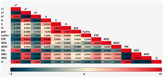 Among photosynthetic traits, A displayed a strong positive correlation with a* (r = 0.8197). In contrast, A showed a strong negative correlation with L* (r = −0.8044, p < 0.001) and a strong positive correlation with b* (r = 0.8044, p < 0.001). The stomatal conductance (gsw) was positively correlated with Ci (r = 0.8481, p < 0.001). Similarly, E was also positively correlated with Ci (r = 0.8456, p < 0.001). ETR displayed a positive correlation with a* (r = 0.8371, p < 0.001) but had a negative correlation with b* (r = −0.8033, p < 0.001).