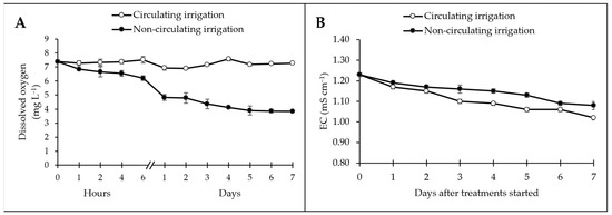 Changes in (A) dissolved oxygen concentration (DO) and (B) electrical conductivity (EC) in nutrient solution between circulating and non-circulating irrigation after treatment.