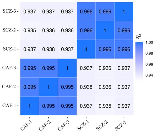 Pearson correlation coefficient of three replicates of CAF and SCZ species.