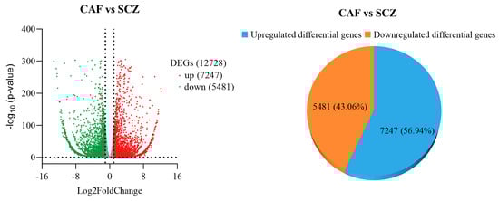 The volcano map of differentially expressed genes (DEGs) in CAF and SCZ species. The percentage distribution of upregulated and downregulated genes is also shown in the figure.