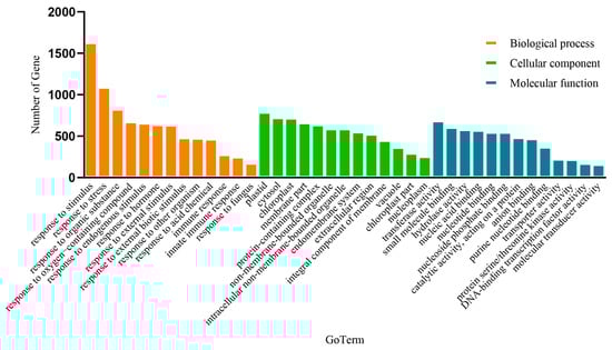 Go analysis revealed that the three primary categories of gene annotations were cell fractions (CCs), molecular functions (MFs), and biological processes (BPs). The responses to stress, organic substances, oxygen-containing compounds, endogenous stimuli, hormones, external stimuli, biotic stimuli, other organisms, acidic chemicals, immune response, innate immune response, and fungal responses were the main biological processes for which the differentially expressed genes were enriched, as shown in Figure 3. In the cellular components, the differentially expressed genes were mainly enriched in plastid, cytosol, chloroplast, membrane part, non-membrane-bounded organelle, protein-containing complex, extracellular region, intracellular non-membrane-bounded organelle, vacuole, chloroplast part, and nucleoplasm. In the molecular function, the differentially expressed genes were mainly enriched in transferase activity, small molecule binding, hydrolase activity, nucleoside phosphate binding, catalytic activity, and purine nucleotide binding. According to these data, the three classes of differentially expressed genes displayed distinct GO functions (Figure 3).