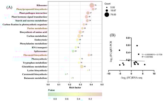A total of 128 metabolic pathways were identified by KEGG enrichment analysis in the SCZ and CAF. The 128 metabolic pathways included ribosome, phenylpropanoid biosynthesis, plant–pathogen interaction, starch and sucrose metabolism, purine metabolism, plant hormone signal transduction, flavonoid biosynthesis, and glutathione metabolism. Fuhrer analysis of pathways was performed based on the synthesis of caffeine and catechins. In phenylpropanoid biosynthesis, 29 DEGs were enriched; in purine metabolism and flavonoid biosynthesis, 20 DEGs were enriched in each pathway, respectively (Figure 4A). The main focused pathways for further study were purine metabolism, phenylpropanoid, and flavonoid pathways in the present study. The purine metabolism pathway is responsible for the biosynthesis and degradation of caffeine. For catechins synthesis, phenylpropanoid and flavonoid biosynthesis were studied. In addition, 14 genes were chosen, and the RT-qPCR was performed to validate the RNA-Seq data. A list of the primers used in RT-qPCR is given in the Supplementary Materials (Table S1). The RT-qPCR analysis results were in accordance with the RNA-Seq analysis, which shows the reliability of the sequence data (Figure 4B). Genes in the KEGG pathway are listed in the Supplementary Materials (Table S4).