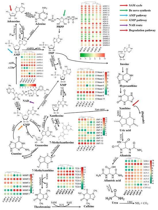 The current study examined and identified the gene expression related to synthesis and degradation in caffeine synthesis. The heat maps of the related gene expression in purine alkaloid metabolism are shown in Figure 2. The expression data of the genes in the purine alkaloid metabolism are also available in the Supplementary Materials (Table S2). In the xanthosine biosynthesis pathway, the significantly upregulated genes included SAMS-3 in both species, CAF and SCZ; SAMS-5 showed significant upregulation in CAF, with low expression noted in the CSZ. PPAT-2, SAHH-2, and ADK-6 were significantly upregulated in CAF and SCZ, while SAHH-1 and ADK-2 showed upregulation only in CAF. The expression levels of APRT-1, APRT-3, APRT-4, and APRT-7 were upregulated in Camellia sinensis var. Shuchazao (SCZ). AMPD-6 and IMPDH-2 were upregulated in the AMP pathway in both species. The 5′-Nase-8 and XMT-13 genes were significantly upregulated in SCZ and CAF. MXMT-3, MXMT-6, TCS-5, and TCS-3 genes were upregulated considerably in the CSZ species, showing the roles of these genes in the caffeine biosynthesis. The TCS-1, TCS-6, and TCS-8 genes showed downregulation in CAF, which indicates the low caffeine content in the Camellia ptilophylla (CAF).