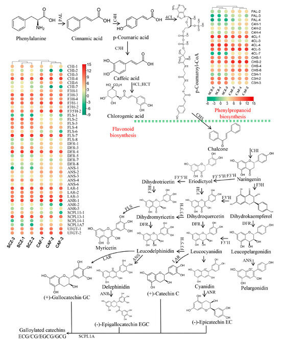 The flavonol synthase (FLS-1 and FLS-8) were downregulated in SCZ while FLS-2, FLS-3, FLS-4, and dihydroflavonol 4-reductase (DFR-3 and DFR-4) were significantly upregulated in SCZ. Leucoanthocyanidin reductase (LAR) showed significant upregulation in SCZ and CAF, except for LAR-2 in CAF. The significant upregulation of glucosyltransferases and serine carboxypeptidase-like acyltransferases 1 subfamily A (SCPL1A) and SCPL13-1 were noted in SCZ and CAF, which resulted in the accumulation of GCG in SCZ. Anthocyanidin reductase (ANR-1) was upregulated, which was consistent with the epicatechin and epigallocatechin. These key genes play a major role in the phenylpropanoid and flavonoid concentration in Camellia sinensis var. Shuchazao (SCZ) and Camellia ptilophylla (CAF). The gene expression data are listed in Supplementary Materials (Table S3).