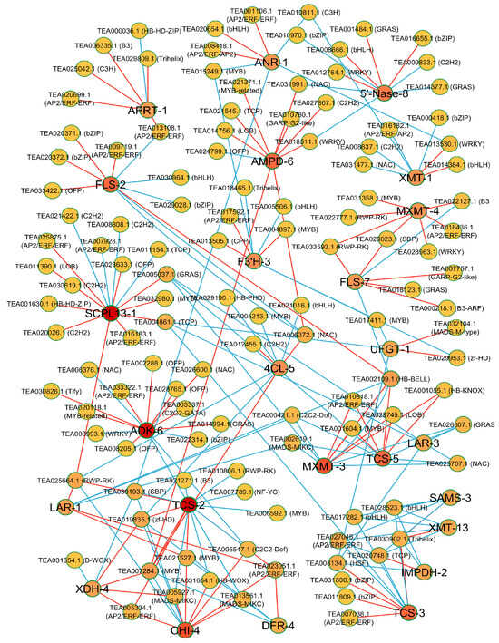 In phenylpropanoid and flavonoid biosynthesis pathways, the key genes that showed significantly upregulated expressions were 4CL-1, CHS-2, CHS-6, C3H-3, FLS-2, FLS-3, FLS-4, DFR-3, DFR-4, SCPL13-1, and ANR-1. The gene in phenylpropanoid biosynthesis 4CL-5 had significant expression in the pathway, which was correlated with C2H2 (TEA012455.1) and NAC (TEA006372.1). The ANR-1 was significantly correlated with two AP2/ERF (TEA001106.0 and TEA008418.1) and bHLH (TEA020654.1). The key gene SCPL13-1 in flavonoid biosynthesis was significantly upregulated and had a significant correlation with two C2H2 (TEA020026.1 and TEA030619.1), MYB (TEA032980.1), and AP2/ERF (TEA025875.1 and TEA016183.1). These results indicate these TFs play a key role in the regulation of the purine alkaloid, phenylpropanoid, and flavonoid biosynthesis pathways. The annotated genes as TFs are listed in Supplementary Materials (Table S5).