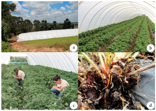 - Picolotto, L.; Vignolo, G.K.; Gonçalves, M.A.; Cocco, C.; Antunes, L.E.C. Produção no campo. In Morangueiro; Antunes, L.E.C., Júnior, C.R., Schwengber, J.E., Eds.; Embrapa: Brasilia, Brazil, 2016; pp. 201–218. Available online: https://ainfo.cnptia.embrapa.br/digital/bitstream/item/179724/1/Luis-Eduardo-MORANGUEIRO-miolo.pdf (accessed on 28 October 2024).