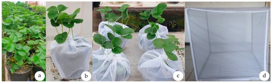 Experimental setup for the bioassay conducted in a vegetation house in Curitiba (Paraná, Brazil) for testing the oviposition preference of Duponchelia fovealis (Lepidoptera: Crambidae) to different strawberry cultivars: (a) pots in the vegetation house; (b) pot protected with voile fabric; (c) experimental unit with four strawberry cultivars; and (d) PVC cage (1 × 1 × 1 m) covered with voile.
