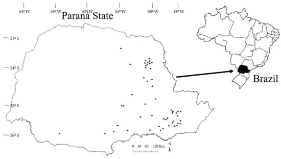 A total of 104 strawberry fields were monitored to detect the presence of D. fovealis larvae in commercial areas (Figure 3). These fields were located in the East and Northeast of the state of Paraná, the main two areas of strawberry crop production. The presence of D. fovealis was confirmed in 93% of the fields surveyed. Appendix A presents the geographical coordinates of the surveyed fields.