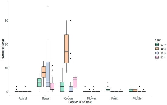 Boxplot of the number of Duponchelia fovealis (Lepidoptera: Crambidae) larvae in different organs of strawberry plants (cv. ‘Albion’) grown in the field under conventional management during the period from 2010 to 2014.