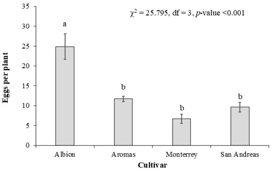 In the conducted bioassay, the ‘Albion’ cultivar had the highest number of D. fovealis eggs per plant, when compared to the rest of the strawberry cultivars considered (p-value < 0.001; Figure 5). In contrast, ‘Monterrey’ had the lowest number of eggs, although not significantly different from those in ‘Aromas’ and ‘San Andreas’ (p-value = 0.24; Figure 5).