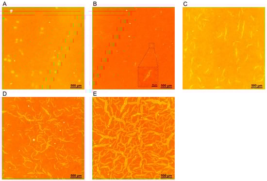 Severity of cuticular cracks. (A): Grade 0 (fruits without cuticular cracks). (B): grade 1 (fruits with cuticular cracks, approximately <300 µm in length, with most cuticular cracks not connected to each other). (C): grade 2 (fruits with cuticular cracks, having a maximum length of approximately >300 µm, with half of cuticular cracks not connected to each other). (D): grade 3 (fruits with cuticular cracks connected to each other, with approximately half of the field of view covered with connected cuticular cracks). (E): grade 4 (fruits with cuticular cracks, forming a net-like structure, with almost the entire fruit surface under view covered with cuticular cracks).