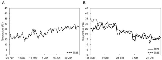 Daily mean temperature during the cultivation period. (A): 2023 spring–summer cultivation. (B): 2022 (solid line) and 2023 (dotted line) summer–autumn cultivations.