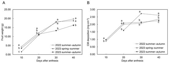 Time–course of changes in fruit weight and cuticular membrane (CM) deposition classified by cultivation season. Values are expressed as the mean ± SE. (A): Fruit weight (n = 67–111). (B): CM deposition (n = 35–71). The open circle indicates the 2022 summer–autumn cultivation, the filled triangle indicates the 2023 spring–summer cultivation, and the filled circle indicates the 2023 summer–autumn cultivation. Different letters indicate significant differences between cultivation seasons using Tukey’s honestly significant difference test (p < 0.05).