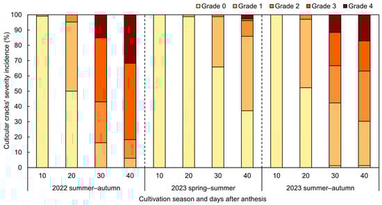 Time–course of changes in cuticular cracks’ severity incidence in developing ‘Nene’ fruits classified by cultivation season. Grade 0 (fruits without cuticular cracks). Grade 1 (fruits with cuticular cracks, approximately <300 µm in length, with most cuticular cracks not connected to each other). Grade 2 (fruits with cuticular cracks, having a maximum length of approximately >300 µm, with half of cuticular cracks not connected to each other). Grade 3 (fruits with cuticular cracks connected to each other, with approximately half of the field of view covered with connected cuticular cracks). Grade 4 (fruits with cuticular cracks, forming a net-like structure, with almost the entire fruit surface under view covered with cuticular cracks).