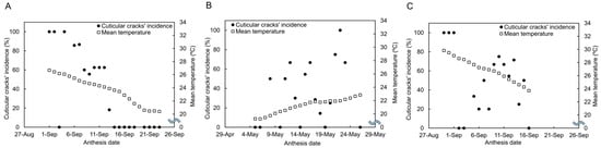 Relationship between the cuticular cracks’ incidence and daily mean temperature from anthesis to the onset of cuticular cracks. Filled circles indicate the incidence of cuticular cracks, and open squares indicate the daily mean temperature. The incidence of cuticular cracks was calculated as the sum of fruits with grade 1, grade 2, grade 3, and grade 4 divided by the total number of fruits on the anthesis date. (A): 2022 summer cultivation (n = 106). Daily mean temperature was calculated over 20 days following anthesis. The incidence of cuticular cracks on 5 and 19 September was not recorded due to the absence of blooming flowers. (B): 2023 spring cultivation (n = 79). Daily mean temperature was calculated over 30 days following anthesis. The incidence of cuticular cracks on 7, 9, 24, and 25 May was not recorded due to the absence of blooming flowers. (C): 2023 summer cultivation (n = 67). Daily mean temperature was calculated over 20 days following anthesis. The incidence of cuticular cracks on 4 September was not recorded due to the absence of blooming flowers.